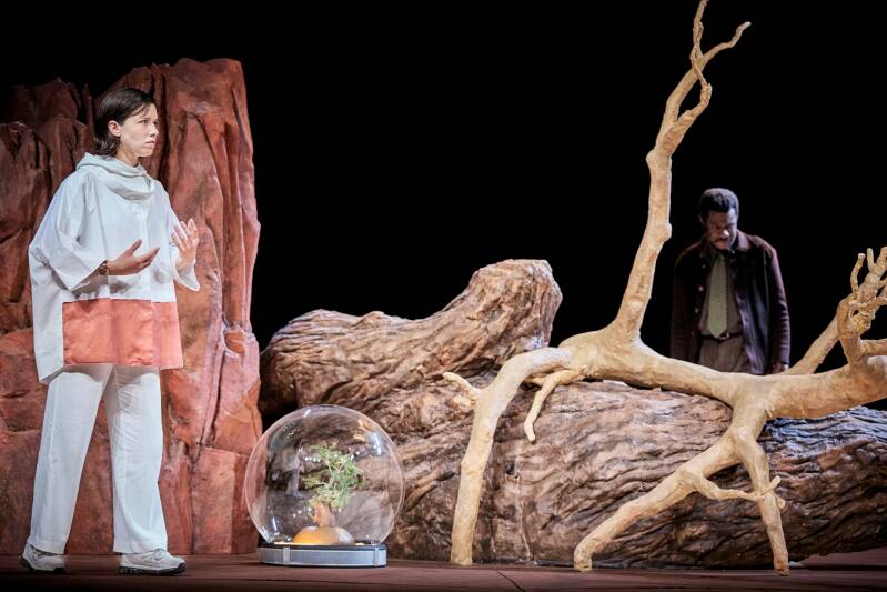 Le texte est construit sous forme de grandes tirades qui se répondent, dans une grande intimité familiale tout comme dans sa dimension intergénérationnelle. Le père et la fille racontent avec elleux deux visions du monde, et plus précisément deux visions pour un autre monde, un monde meilleur. Au fur et à mesure des messages se dessinent les contours de ce qui reste de la Terre dans cet avenir pas si lointain. La dystopie imaginée par Tiago Rodrigues implique des interrogations philosophiques, auxquelles s’efforcent de répondre les personnages. L’humanité, qui paie les conséquences des désastres écologiques, est face à un dilemme : faut-il reconstruire ici, ou tout recommencer ailleurs ? Et comment recommence-t-on ? Quelle est la place de la mémoire dans ce nouveau monde ? Le choix n’est pas si simple, et l’on sort du spectacle sans vraiment savoir quelle décision est la bonne.